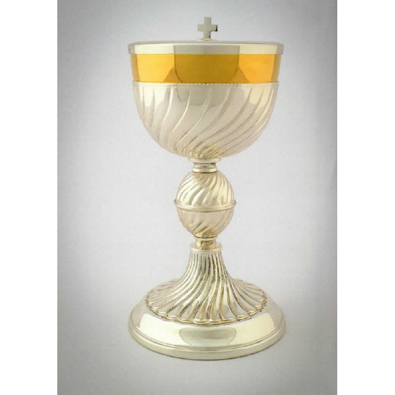 Pisside in ottone argentata, altezza cm 21,5 diametro cm 11 capienza particole circa 200. Disponibile anche dorata.