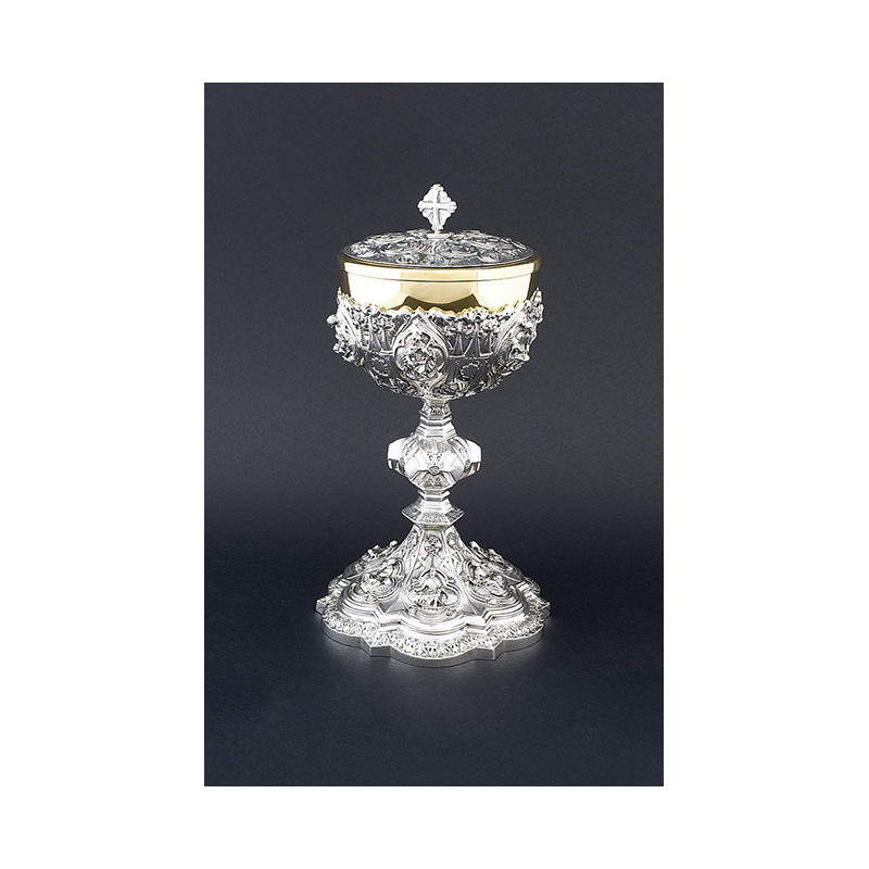 Pisside di fusione argentata, altezza cm 21,5 diametro cm 11 capienza particole circa 200. Disponibile anche dorata.