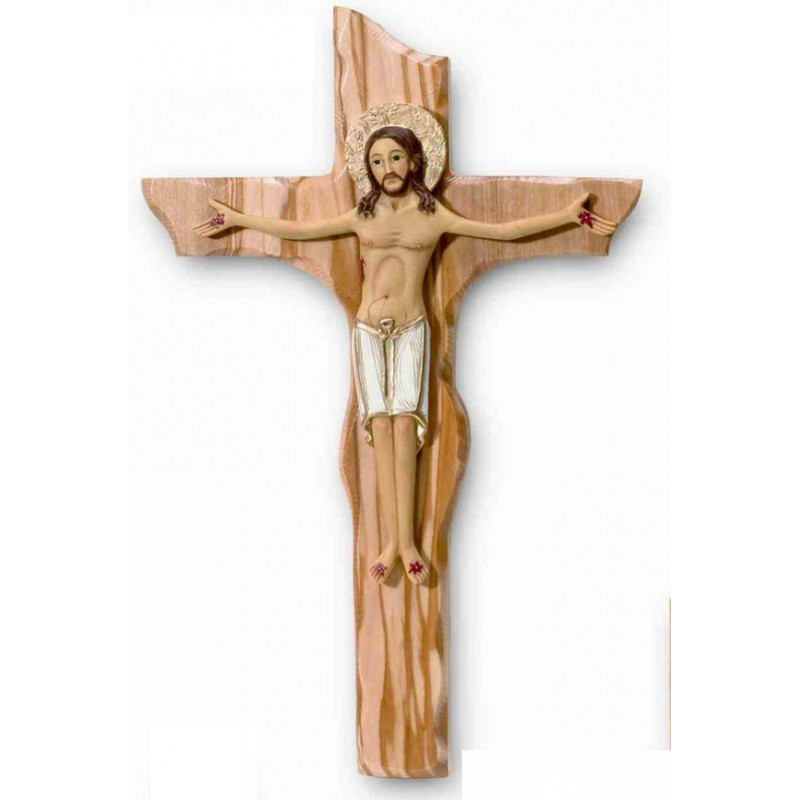 Croce in legno d'ulivo con Cristo a rilievo in resina dipinto a mano.