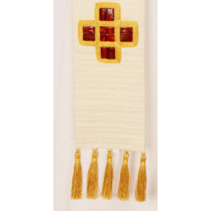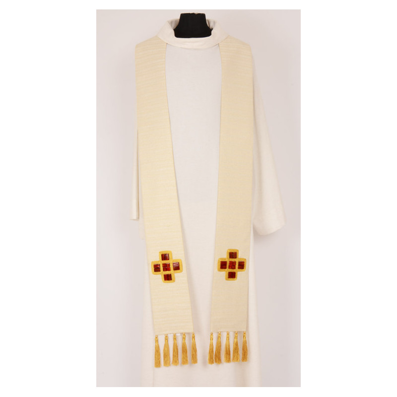 Stola in lana/viscosa con fiocchi, la croce è realizzata con un intreccio di cordoncino oro e pietre.