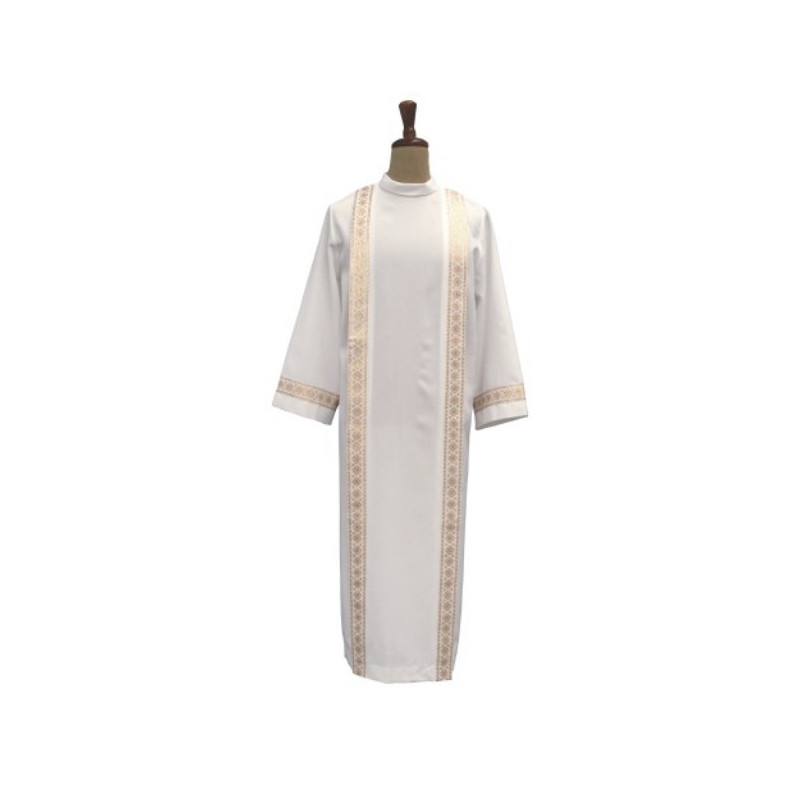 Tunica per Prima Comunione in 100% poliestere bianco candido, collo risvoltato, con pieghe e manica a giro. Con bordure da 5 cm laterali e sulle maniche.