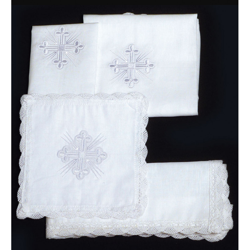 Completo Messa 4 pezzi in misto lino, ricamo croce con raggi.