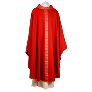 Casula in pura lana con stolone e collo in seta greggia rigata. Disponibile nei quattro colori liturgici e con le varianti: in tessuto morello per il periodo dell'avvento e in rosacea.