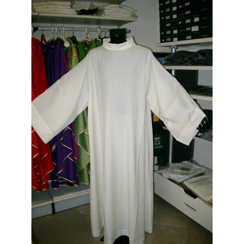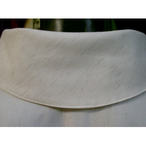 Camice in Tessuto Sahara poliestere viscosa, lavorazione grezza, tinta sabbia , scampanato con manica a giro, colletto a cocolla. Confezione sartoriale.
