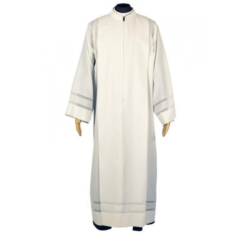 Camice in terital lana leggero, dritto con pieghe, manica a giro e collo alla coreana. Due giri di pizzo sulle maniche e sul fondo. Disponibile in colore avorio e pizzo bianco oppure camice bianco e pizzo ecru. Confezione sartoriale.
